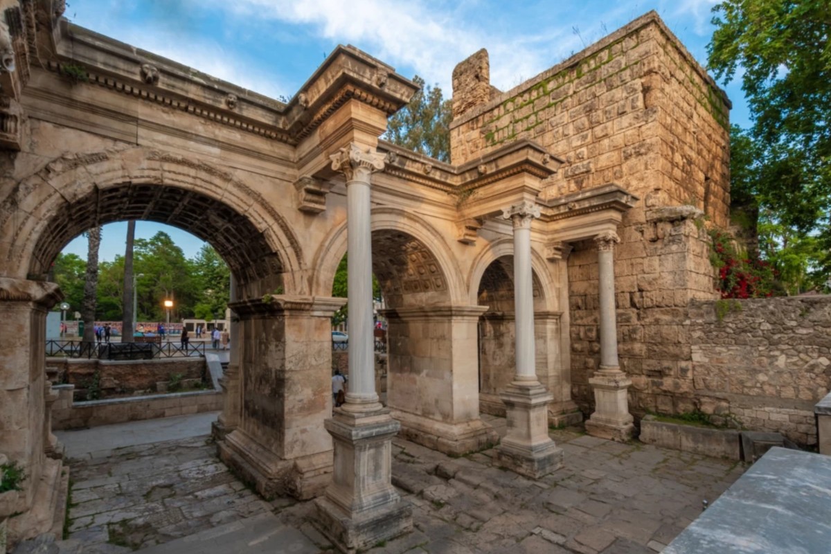 دروازه هادریان (Hadrian’s Gate) یکی از مهمترین یادگارهای دوران روم باستان در آنتالیا است که در سال 130 میلادی، به افتخار ورود امپراتور هادریان ساخته شد. این سازه سه طاقی از سنگ مرمر سفید، با سرستونهایی به سبک معماری رومی، جلوهای باشکوه دارد. گفته میشود این دروازه، در گذشته دو طبقه بوده؛ اما امروزه فقط طبقه اول آن باقیمانده است.