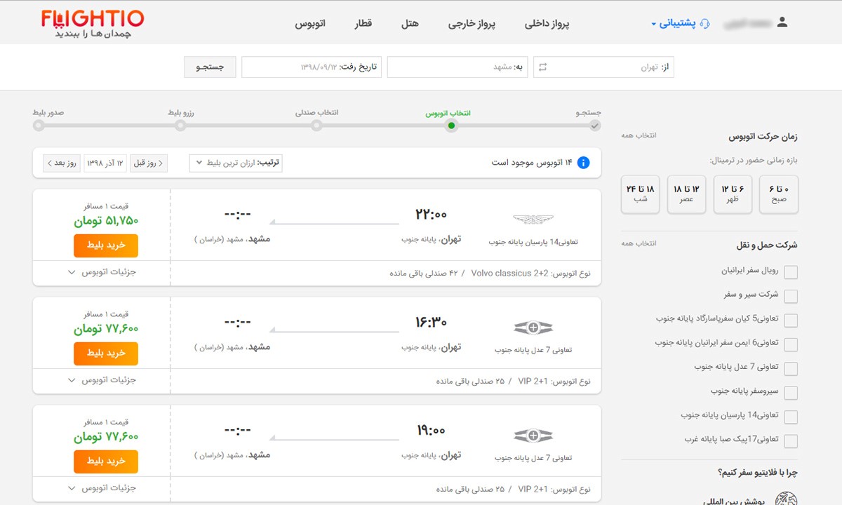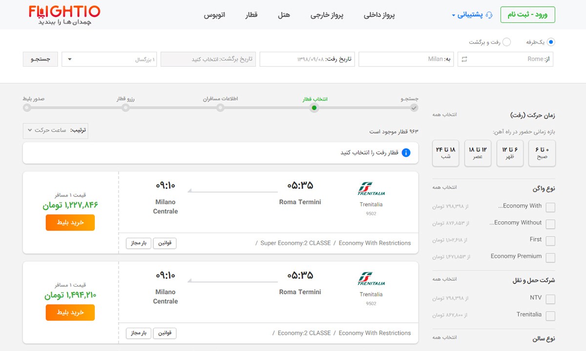 در این بخش گزینههای موجود با تاریخ و مقصد درخواستی شما نمایش داده میشود. میتوانید از منوی سمت راست، گزینهها را محدودتر کنید تا به انتخاب دقیق خود برسید. شرایط را میتوانید از قطار کوپه به همگانی تغییر دهید تا قیمت هم کاهش پیدا کند. پس از اینکه گزینه مورد نظر خود را پیدا کردید، گزینه خرید بلیط را بزنید و وارد بخش ورود اطلاعات شوید.