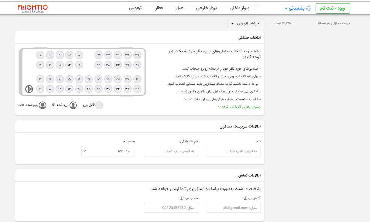 تمامی اطلاعات مورد نیاز را وارد کنید. این اطلاعات همگی برای صدور بلیط لازم است. همچنین اطلاعات ارتباطی خود شامل آدرس ایمیل و شماره تماس را هم وارد کنید تا بلیط خود را به راحتی دریافت کنید.